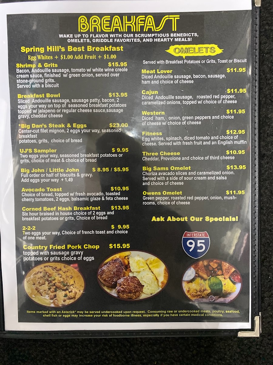 Center-cut filet mignon, two eggs your way, seasoned breakfast potatoes, Grits, and your choice of bread.